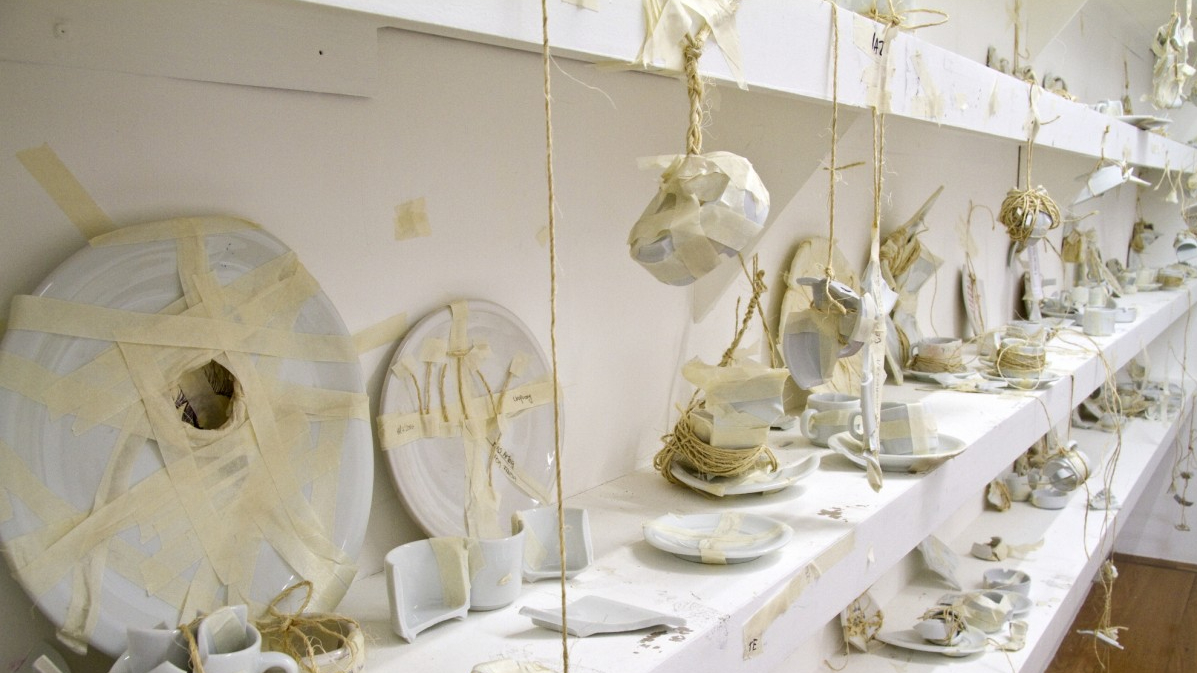 A zsineggel, ragasztóval, ragasztószalaggal “meggyógyított” tárgyakat a fehér galériatér fehér polcain helyezik el, mint a részvétel, a kollektivitás, az együttműködés tárgyiasult eredményét.