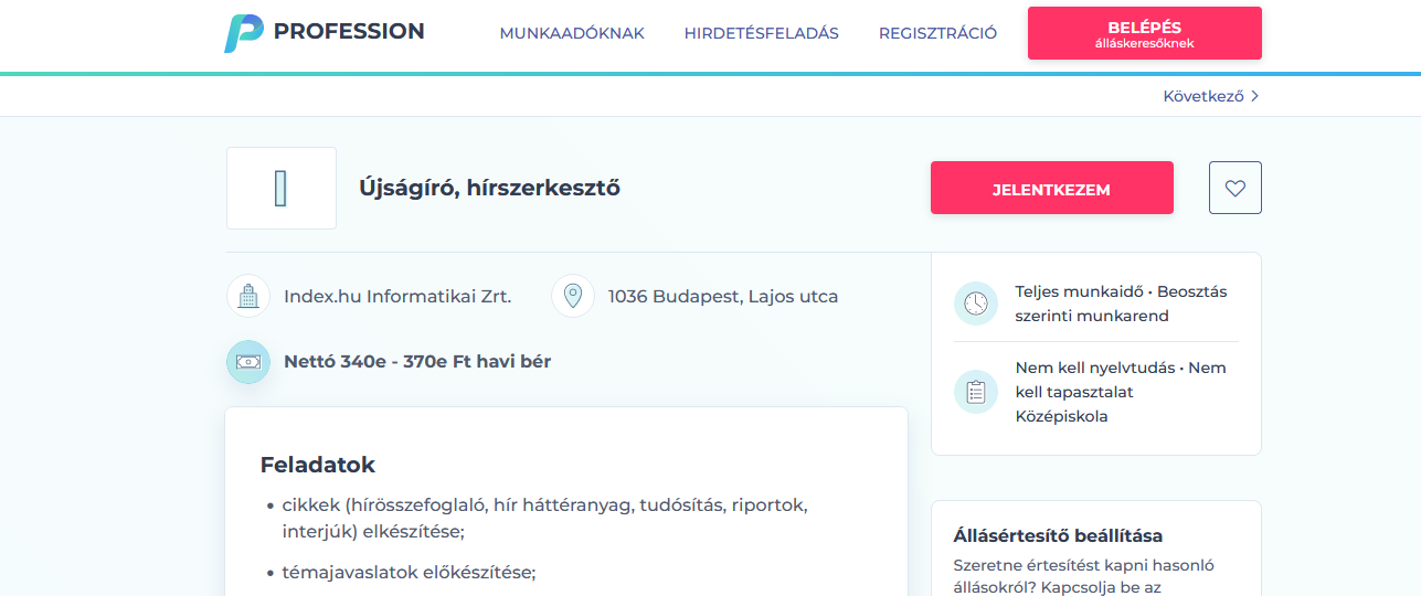 Tényleg nem mindegy, mennyi is az annyi, az Indexben most 370 ezer nettót lehet keresni kisújságíróként az aktuális álláshirdetés tanúsága szerint.